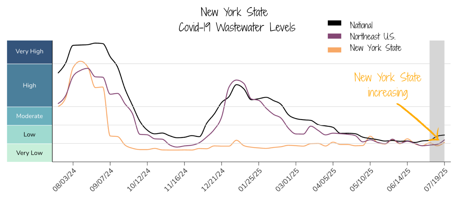Wastewater data is showing that COVID-19 is increasing in New York City and across the state, though on average levels remain low.
