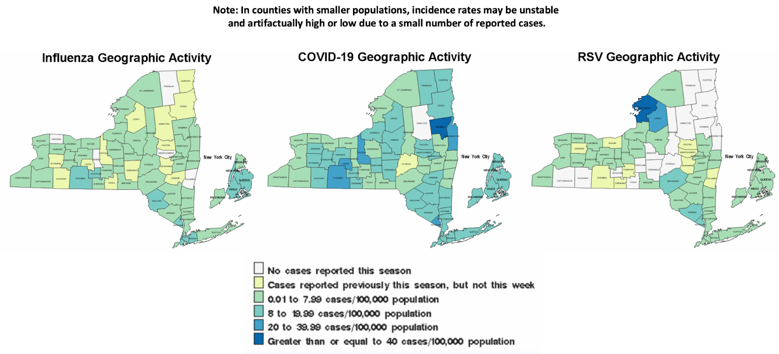RSV: Also increasing across the state and in NYC, mostly in kids under 4. Statewide, cases increased by 19%, while emergency department visits in NYC went up by 67%.