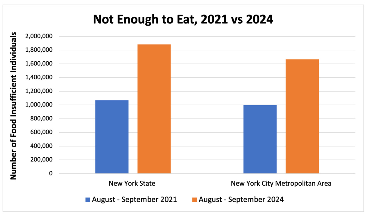This isn’t just a big city issue. Across New York state, 1 in 8 (12.5%) of residents lived in food insecure households from 2021 to 2023, including 1 in 6 children. On top of that, cuts to the SNAP program in the “Big Beautiful Bill”—signed into law over the summer—will likely further exacerbate food insecurity in New York, as they reduce food assistance for low-income families.