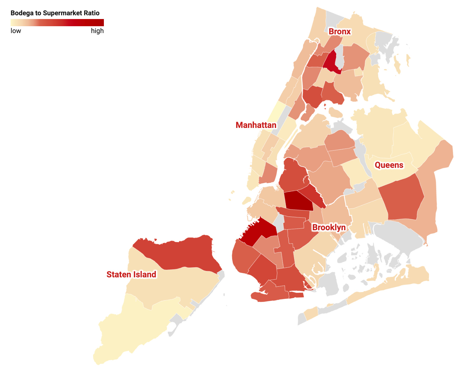 A way to measure this in NYC is to look at the ratio of bodegas to supermarkets across neighborhoods. The Bronx, which has the highest food insecurity in the city, has about 35 bodegas per 1 supermarket.