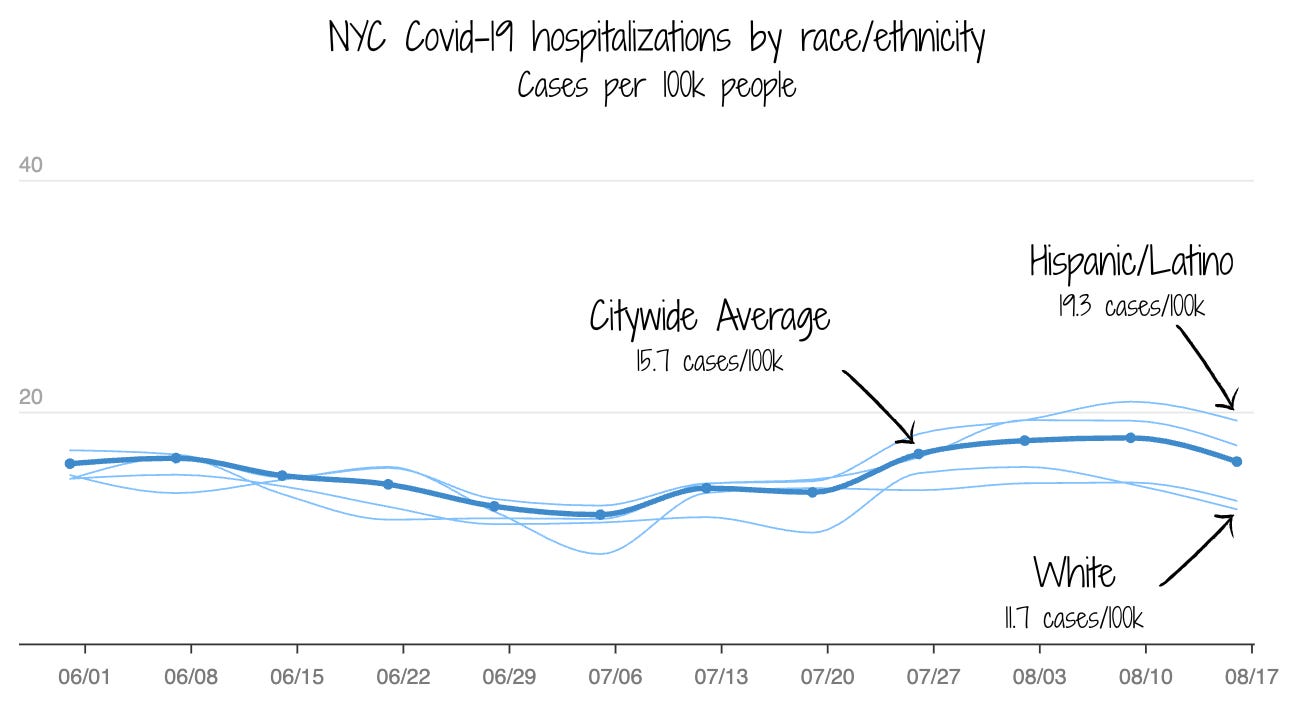 Hispanic and Latino people have about twice the rate of hospitalization compared to white people. This likely reflects longstanding structural inequities, including greater exposure to risk (from factors such as relying on public transportation or working in more public-facing jobs), more crowded housing, and limitations in health care access, rather than differences in underlying health alone.