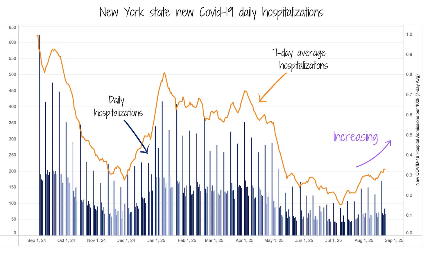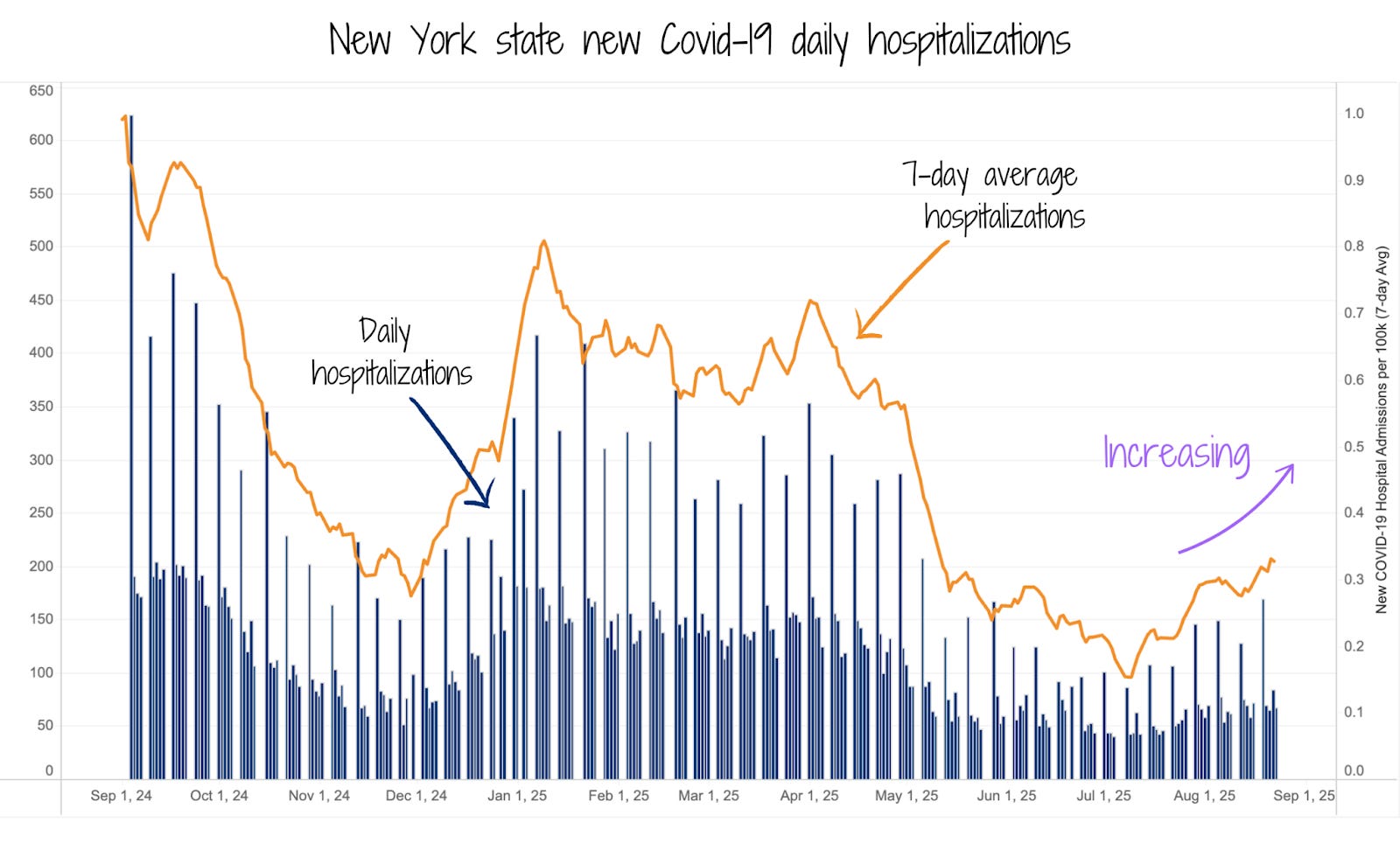 All regions of New York show that Covid-19 hospitalizations are elevated. Hospitalizations are still substantially lower than they were this time last year, but are increasing. Given what’s happening in other states, like Florida and Hawaii, we expect increases to continue.
