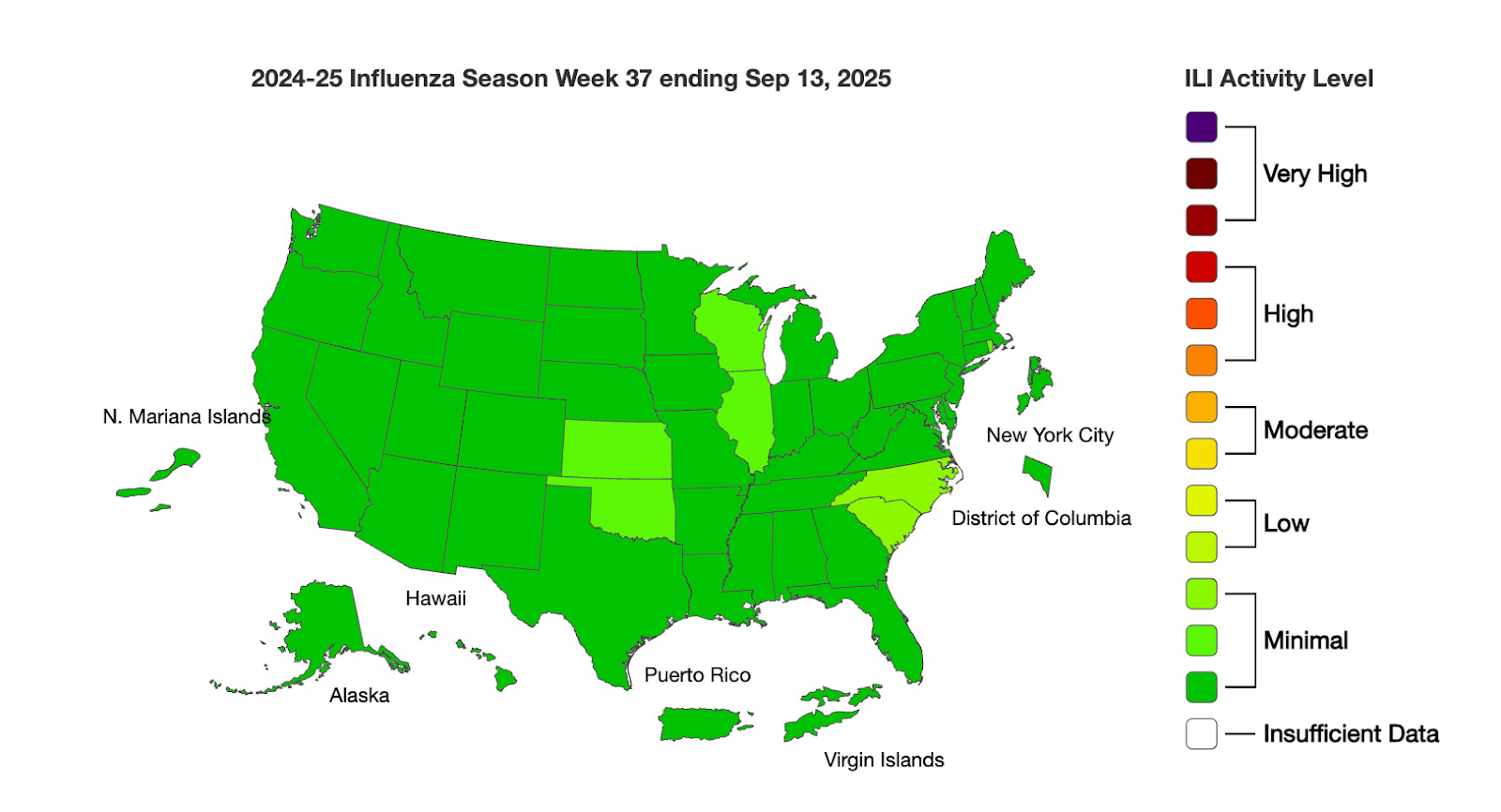 All states, including New York, are at the minimal influenza-like illness (ILI) level, and New York wastewater shows no flu activity.