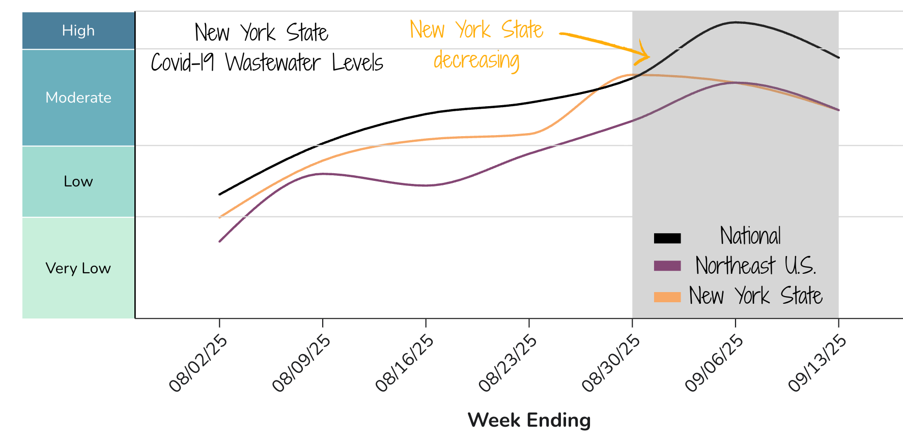 Forecast: Moderate and declining as measured by wastewater data, signaling that we’ve made it through the worst of the summer surge.