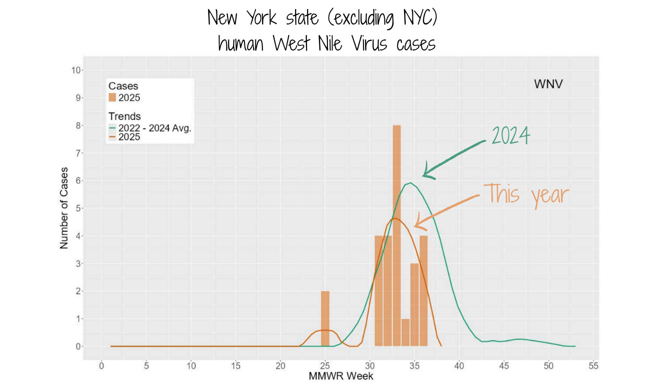 But more mosquitoes have tested positive so far this year compared to last. Even though there are fewer counties detecting EEE, the detections are more concentrated in a smaller area—there’s a hotspot in Central New York.