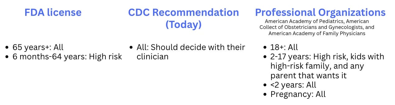Depending on what state you live in, though, you may still need a prescription. ACIP’s guidance is now more broad than FDA’s: FDA continues to classify the Covid vaccine as “off-label” for some groups (like healthy adults and children without underlying conditions). In some states, this ACIP/CDC vs. FDA mismatch could mean patients need a prescription to access the vaccine.