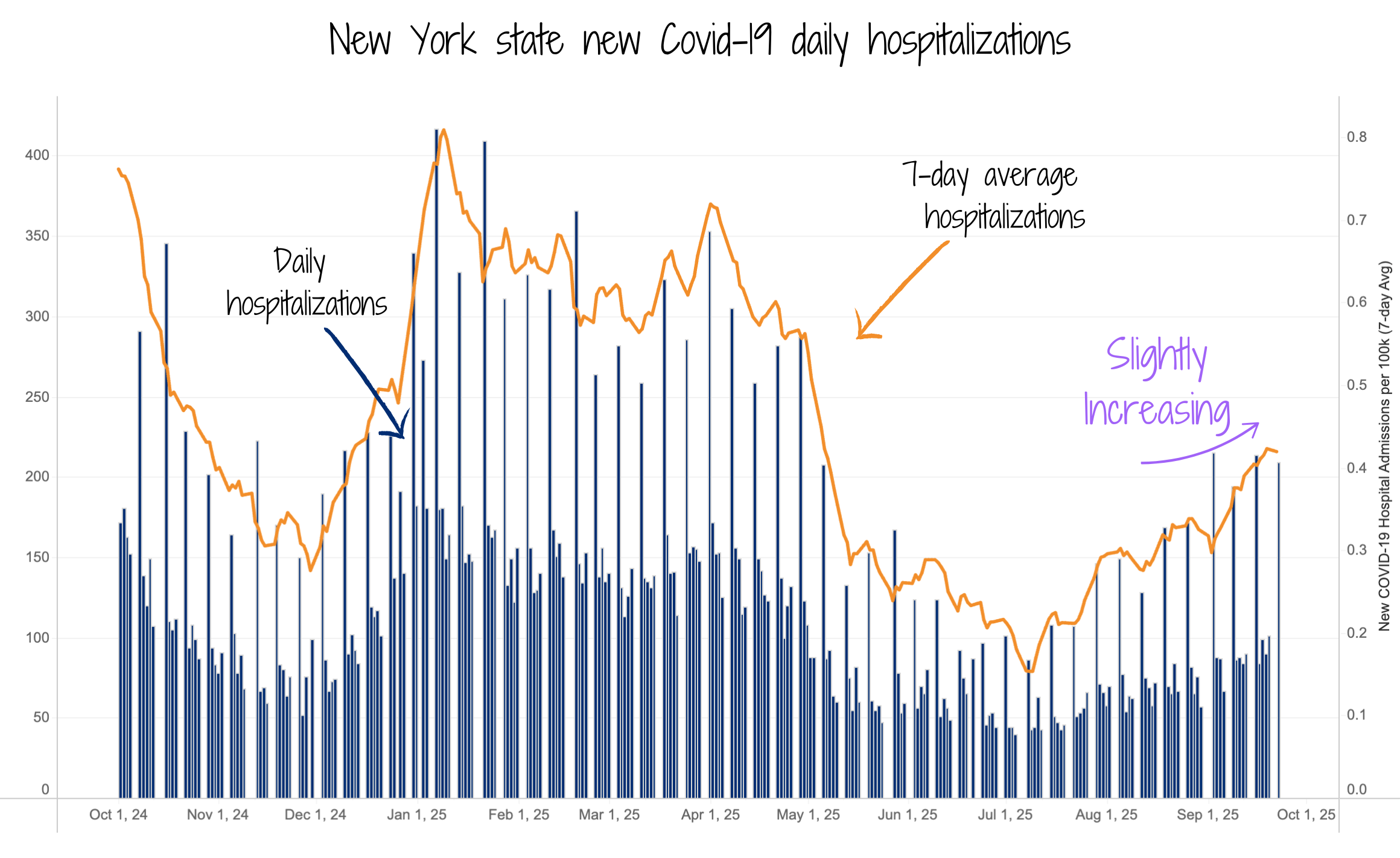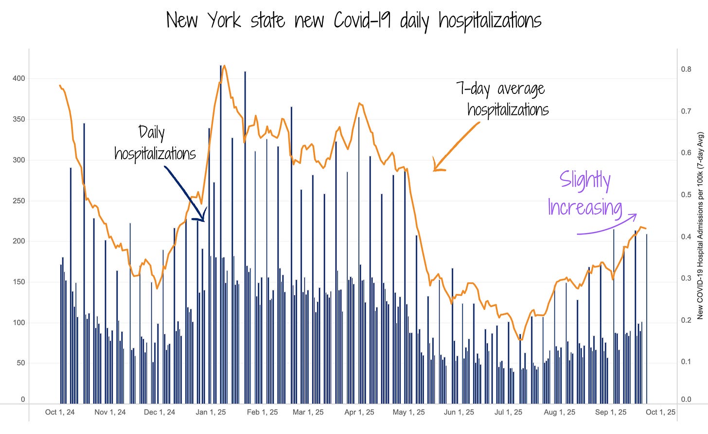 Covid hospitalizations are still elevated. Because wastewater is a leading indicator and has just started decreasing, we can expect hospitalizations to follow and begin decreasing in the next week or two.