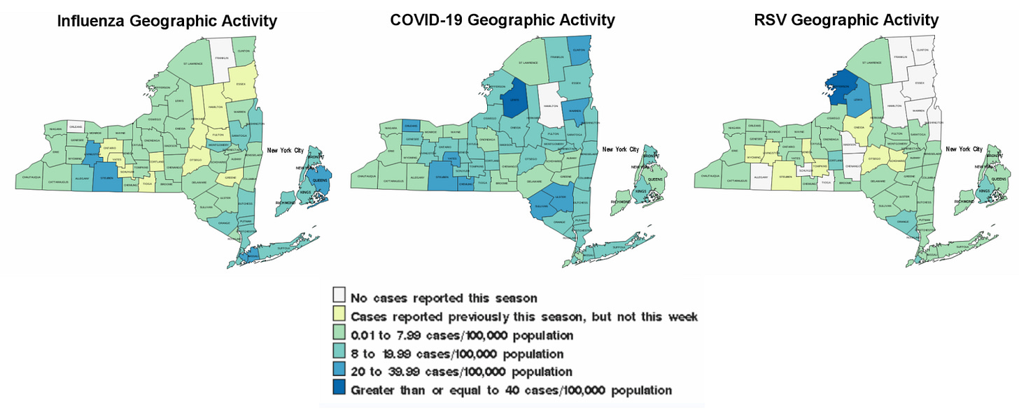 RSV: Also increasing across the state and in NYC, mostly in kids under 4. Statewide, hospitalizations increased by 70%, while emergency department visits in NYC went up by 40%.