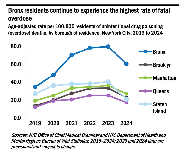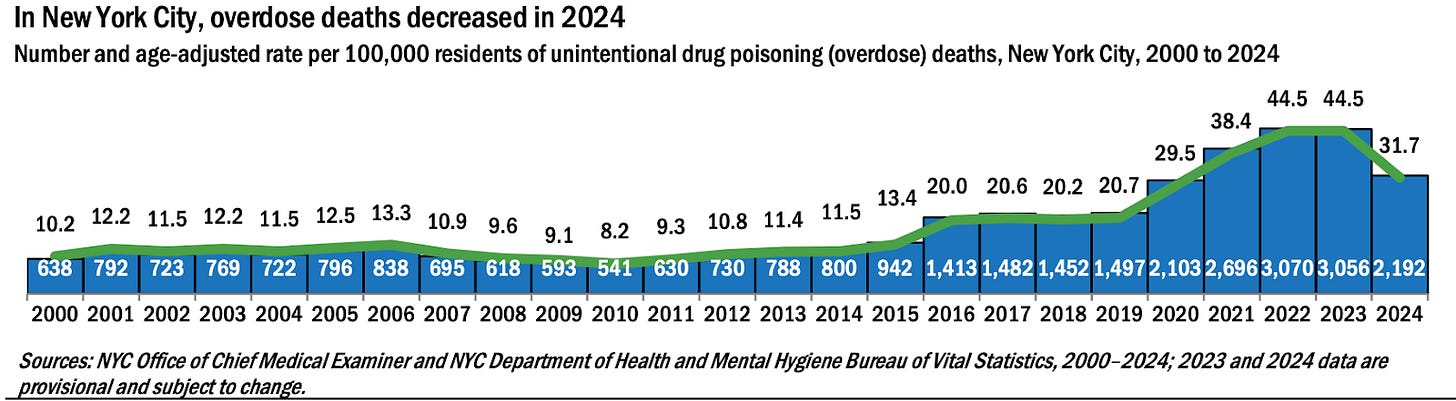 For the first time in years, NYC saw a significant drop in overdose deaths—a 28% decrease last year from 2023—but that still totals 2,192 deaths: far too high.