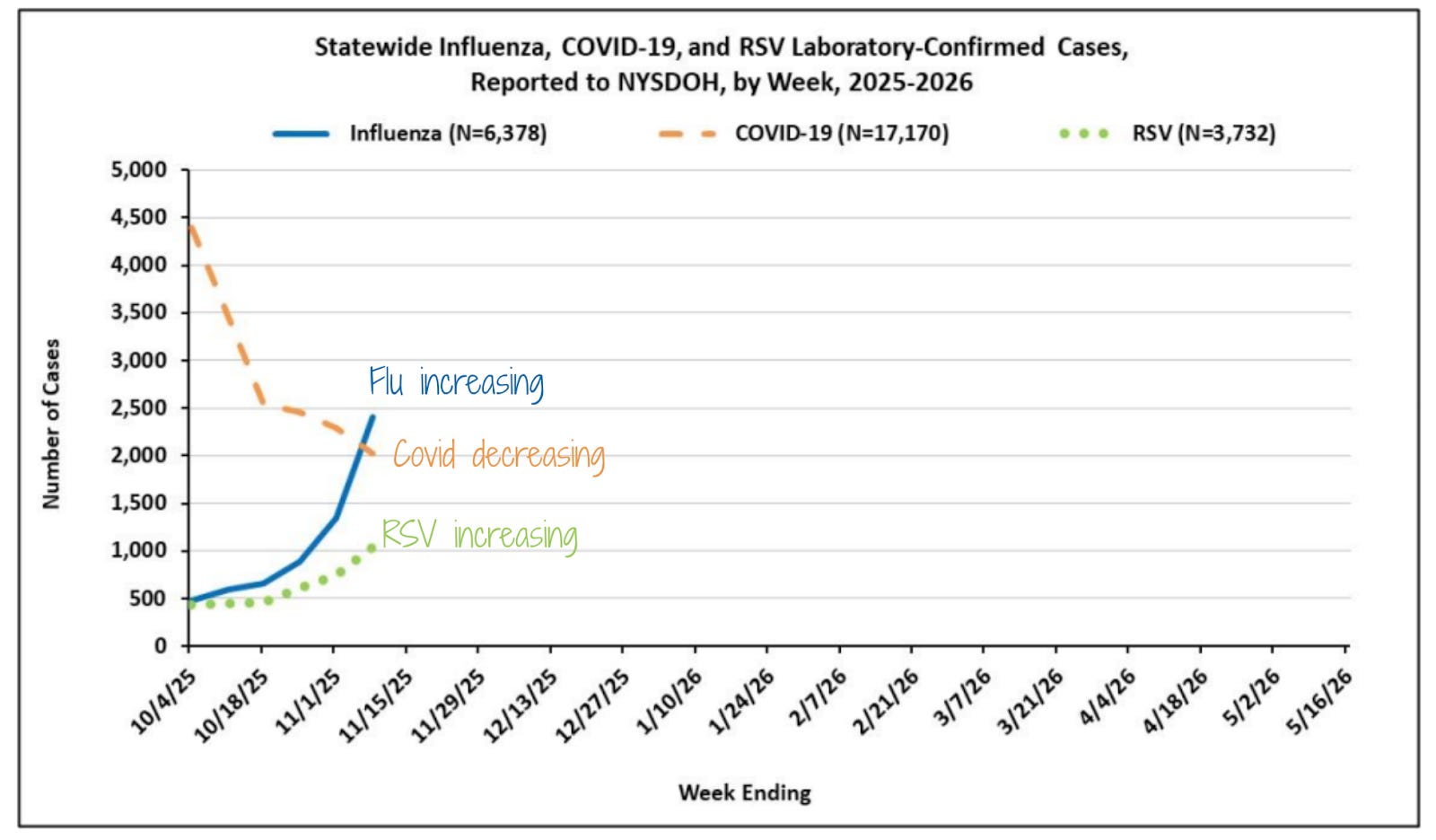 Flu: Flu is increasing quickly. The most recent data show that cases and hospitalizations in the state have increased by 78% and 53%, respectively. In NYC, emergency department visits for the flu rose by 104%.