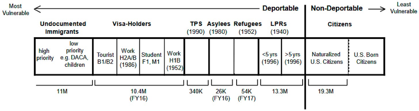 As this graphic shows, many U.S. residents are not citizens and live here under work visas, green cards, or are somewhere in the process of gaining citizenship. Reports of raids and deportations can instill fear in all of these groups and lead to avoidance of essential services.