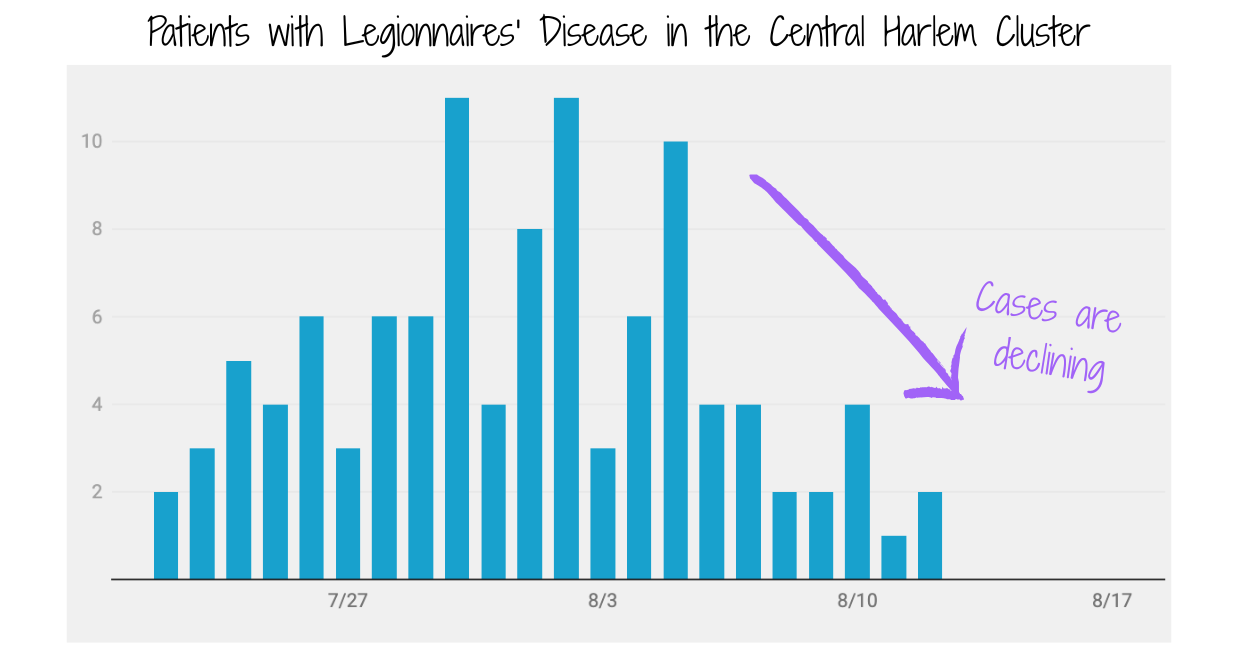 The most recent case developed symptoms on August 12, which means we’re likely closer to the end of the outbreak. That’s good news. It means that mitigation efforts (like identifying and cleaning contaminated cooling towers) are working.